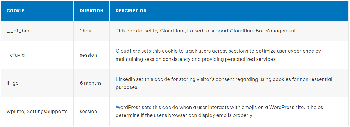 | __cf_bm | 1 hour | This cookie, set by Cloudflare, is used to support Cloudflare Bot Management. |