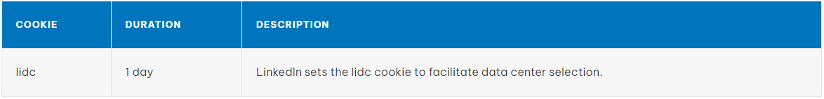 | lidc | 1 day | LinkedIn sets the lidc cookie to facilitate data center selection. |