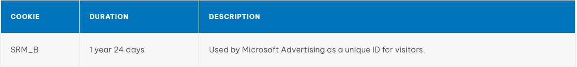| SRM_B | 1 year 24 days | Used by Microsoft Advertising as a unique ID for visitors. |