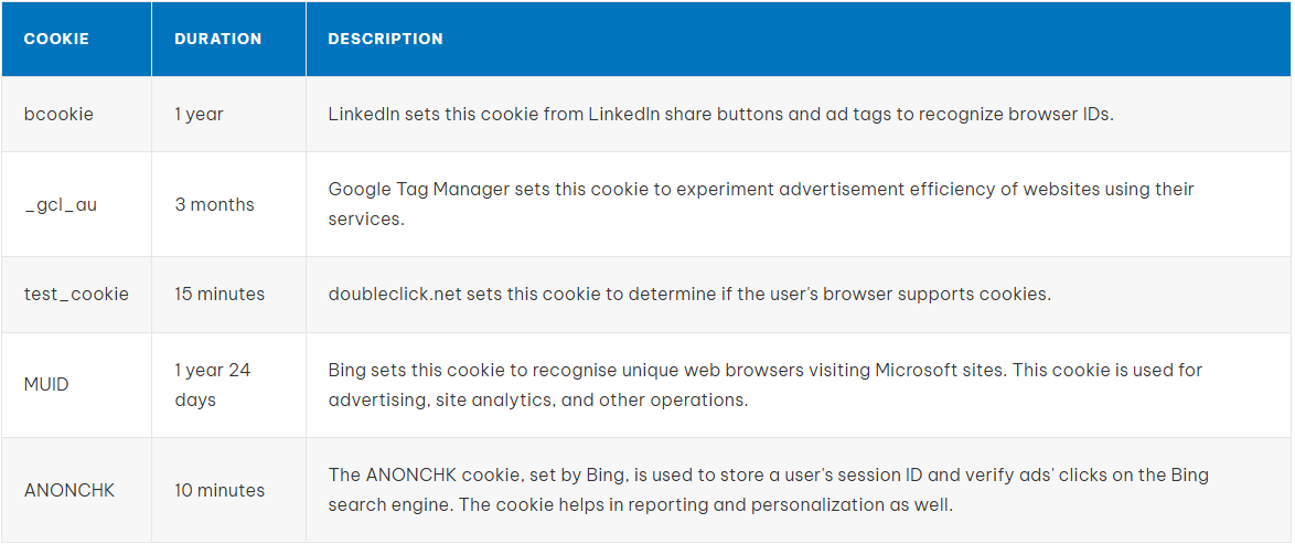| ANONCHK | 10 minutes | The ANONCHK cookie, set by Bing, is used to store a user's session ID and verify ads' clicks on the Bing search engine. The cookie helps in reporting and personalization as well. |