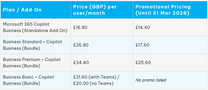 | Business Basic + Copilot Business (Bundle) | £21.60 (with Teams) / £20.00 (no Teams) | No promo listed |
